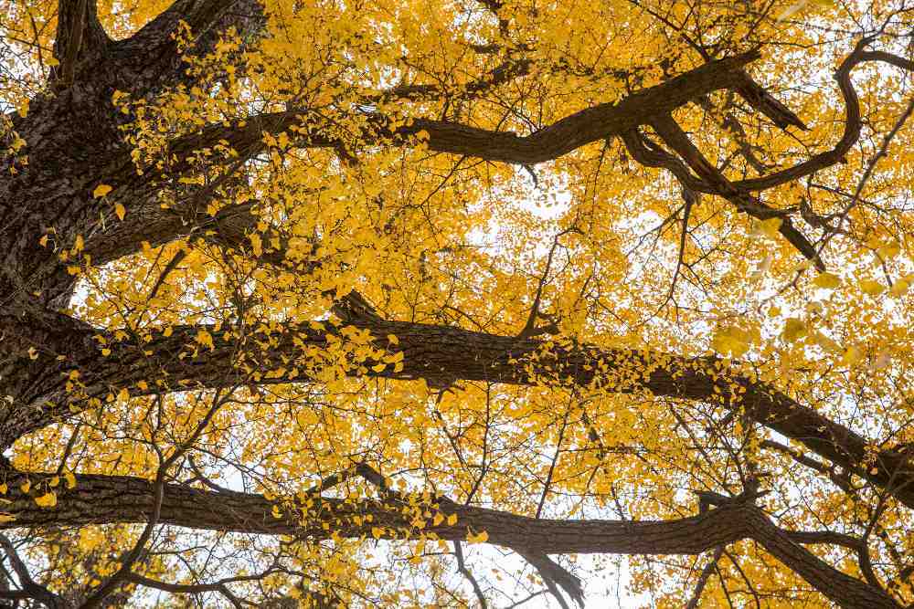 银杏又名白果、公孙树,雌雄异株,生命力极强,有生物界“活化石”之称。文殊寺的银杏树,树高均在25—40米之间,这几棵大树,最低者35米。其中,最大的一棵树冠高达43米,胸围6.85米,需几个人手拉手方可环抱,这已经叫人称奇了,然而尤其让人惊奇的是,胸部有一10厘米的洞口,透过它能清楚地看到树干内被锯掉过一块长1.7、宽0.8米木板的空隙,下部留有用手掰掉过的锯茬仍历历在目。一棵囫囵树干,中间怎能取出一块大木板呢?据说,这是鲁班的神功所为。而最小的一棵,树围也在5米以上。整个银杏群虬枝盘错,枝叶相连,夏季郁郁葱葱,遮天蔽日;秋季流光溢彩、璀璨夺目,如置身金色的佛国世界,蔚为壮观。