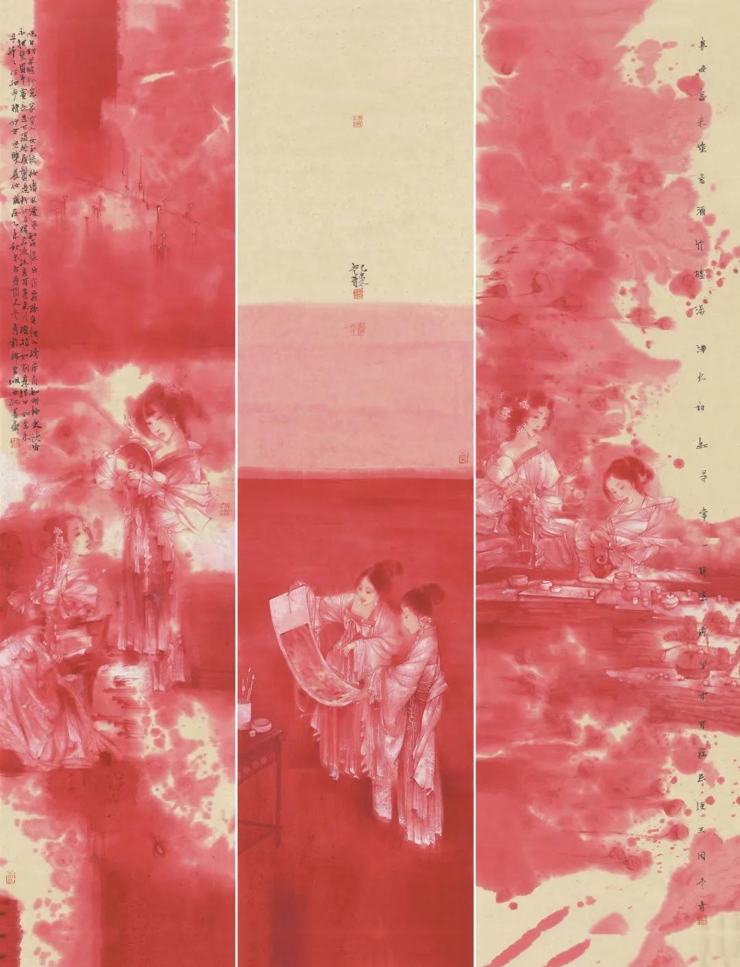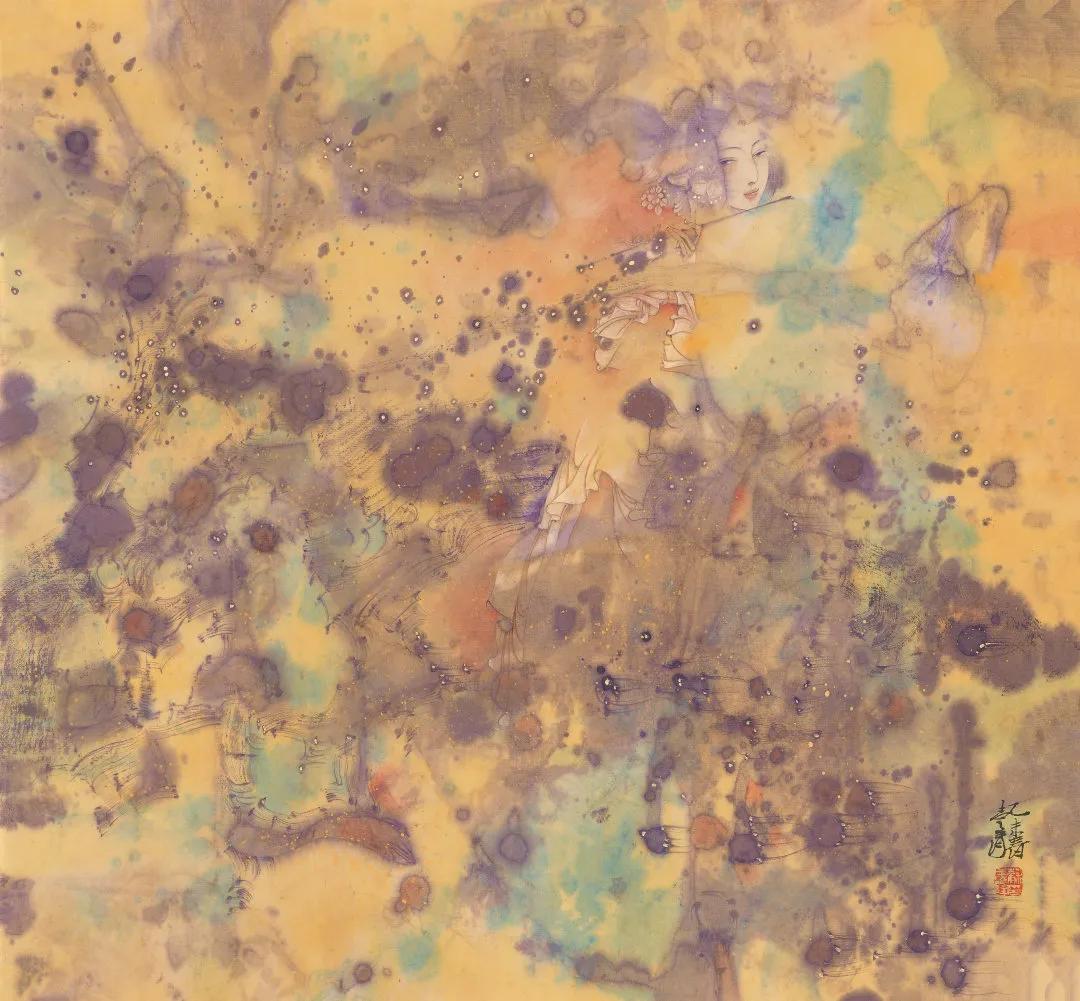 他在画面中平衡着东方线条的曲径通幽和西方构成的直线分割,平衡着古典的形象塑造和现代的抽象意味。往往,他的“仕女”多继承着传统方式,用挺劲柔韧的线条勾勒,“线”本身的美学含义,在他的作品中也被放大,他不仅通过“线”来塑造形体,也通过“线”来抒发性情,平衡疏密和构成等关系。而在“线”的基础上,则是他的用墨用色,在恣肆的泼墨泼彩,潇洒的皴擦点染中,形成了变化丰富、层次厚重、明媚雅致的色墨效果,而这些都构成了他娴熟醇厚且个性鲜明的笔墨语言。值得一提的是,苏先生多在画中题写长跋,大量的文字在赋予作品诗情画意的同时,也成为画面布局和块面分割的重要部分,意味隽永。
