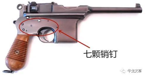 二是为简化加工,也和BH公司的产品一样,大量使用销钉结合内部机件,以至于枪身的右侧尚有七颗销钉暴露着,“七钉盒子”也就因此成为它在中国的又一个俗称。请看: