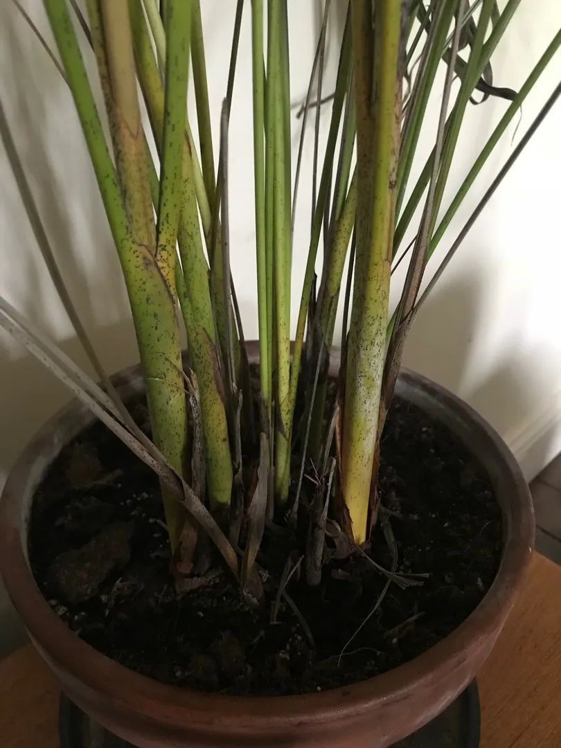 平常养护的盆栽散尾葵或袖珍椰子,一旦发现有发黄枯萎的叶子和枝条,一定要及时剪掉,如果只是叶尖发黄,那就将发黄部分的剪掉。
