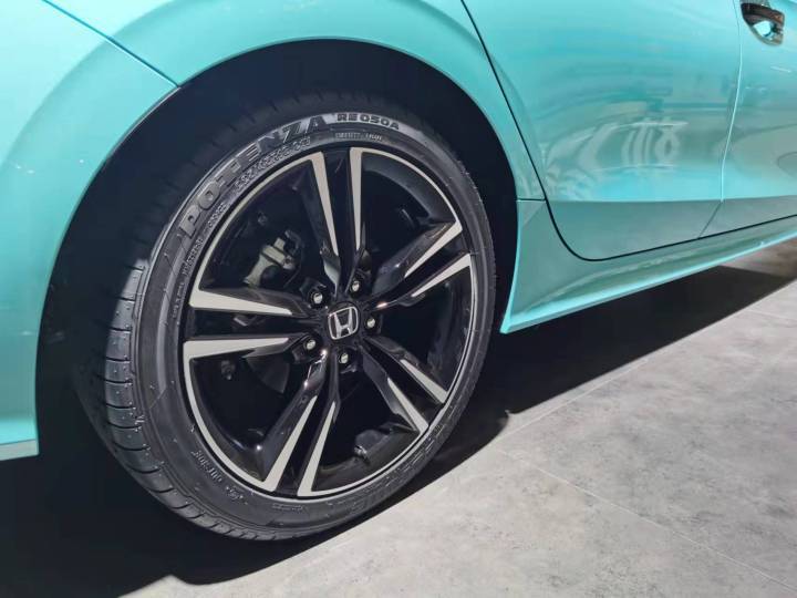 这款轮毂为银黑双色双幅样式,轮胎尺寸为225 45R18,品牌为普利司通,其型号为POTENZA RE050A,该款轮胎是其品牌最具代表的运动型轮胎。