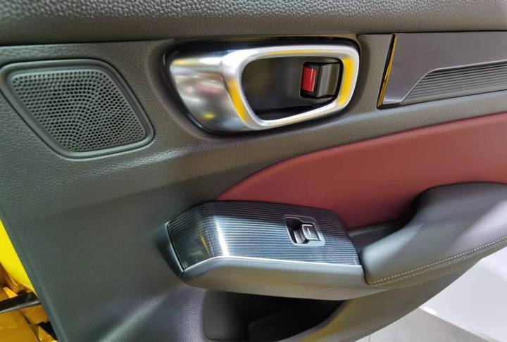 在门扶手上,也是采用了同样的纵向分布的纹路材质,加上金属色的门把手,以及红色和黑色两种不同材质的视觉冲击,这款车的运动感在车内也能够体验到。