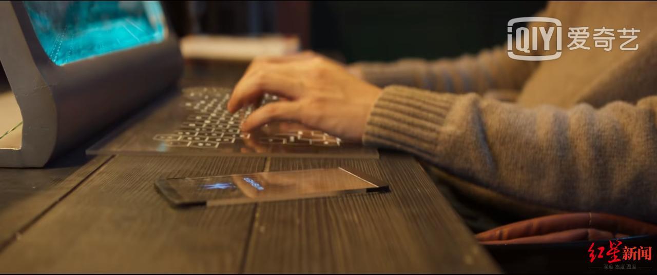 这种架空又带有科幻、未来感的背景却在实际拍摄中呈现了强烈的割裂感。比如一开始男主裘文东坐在电脑前,一个造型怪异的悬浮键盘和全透明的手机呈现了一种未来感,绿藤大学里的全屏透明显示器也有一定的科技感。