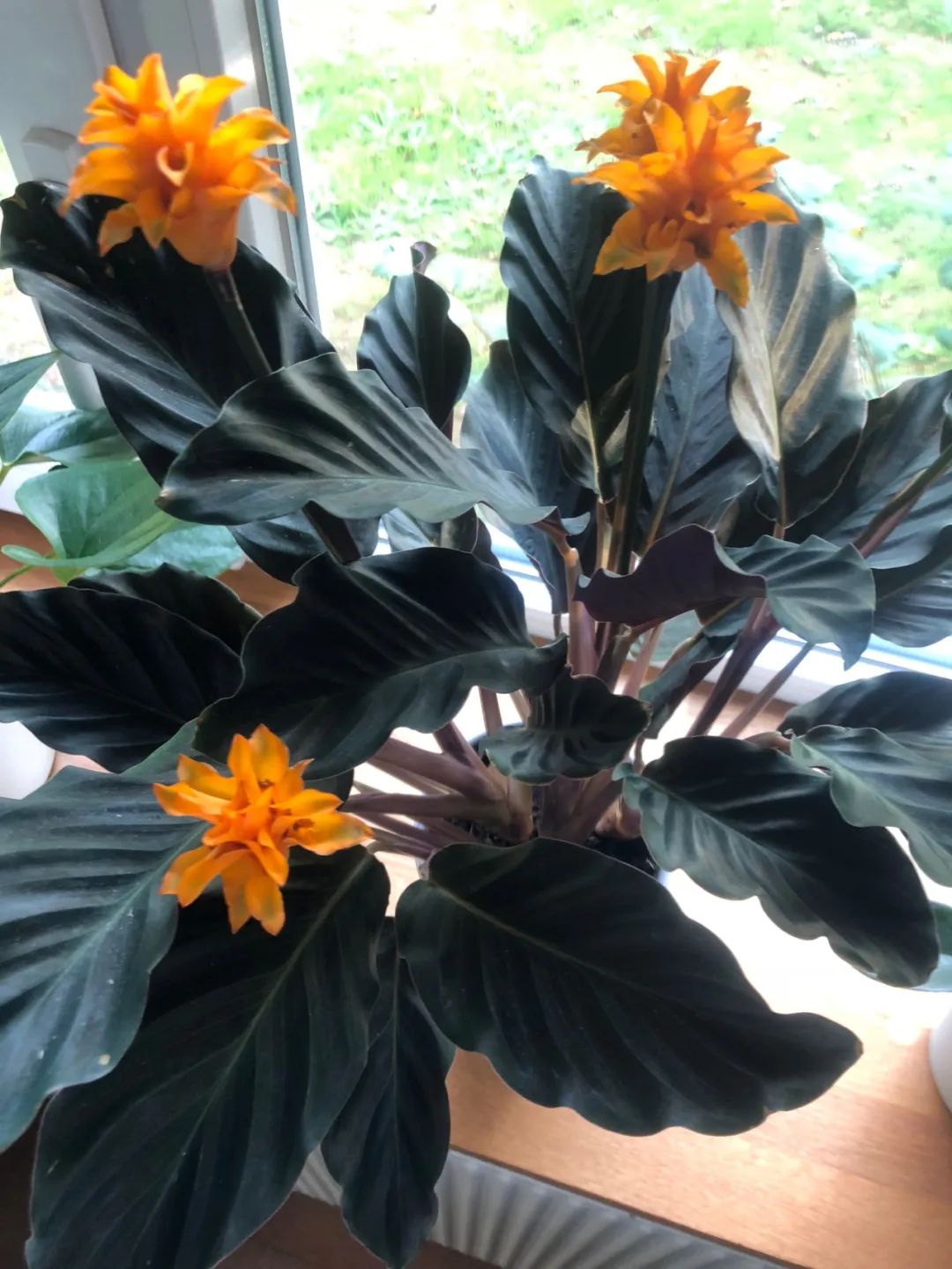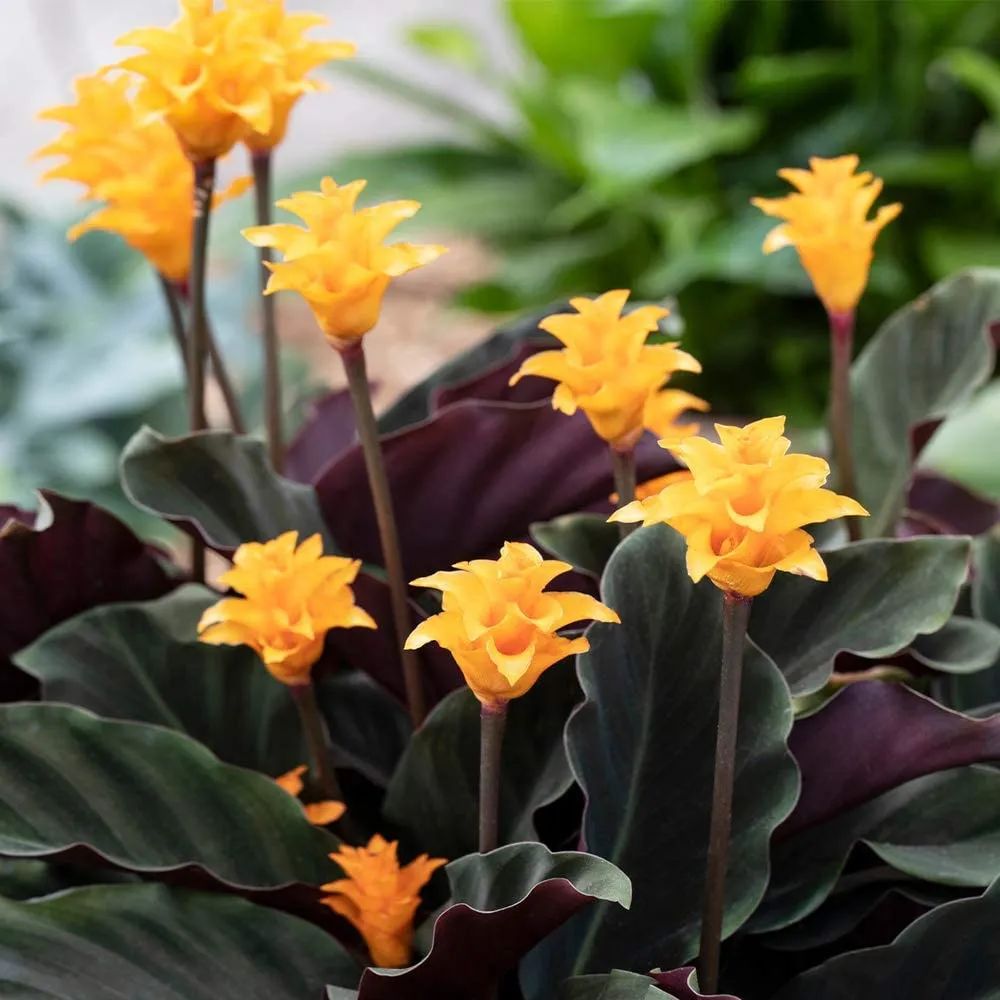 黄苞竹芋是属于观赏竹芋的一个品种,它在叶面是深绿色的,会有波浪状的皱褶,叶子背面则是紫色的,能开出橙黄色的火焰状花朵。
