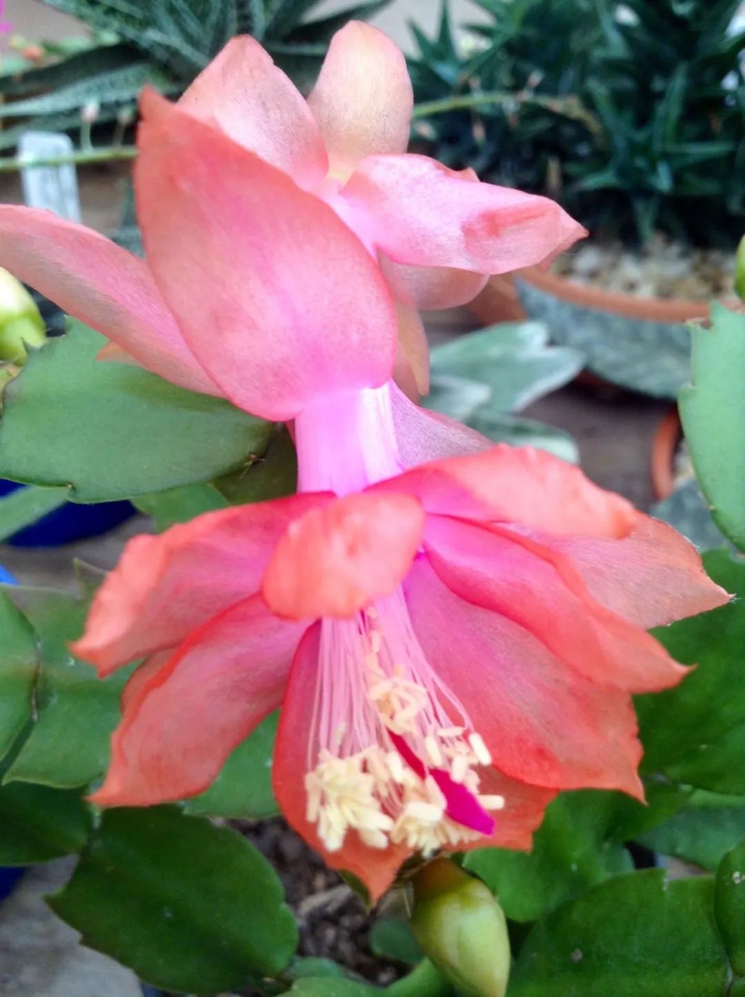 蟹爪兰是一种热带雨林里的附生型仙人掌植物,它比较喜欢柔和的散射光,有不同的花色,包括常见的红色、粉色、黄色、橙色和白色等,它的花朵就开在枝条的顶端。