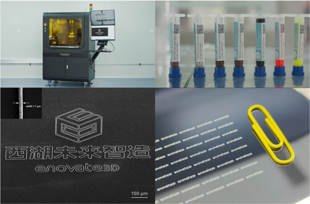 关于与打印设备相配套的材料体系,据悉,西湖未来智造主要开发的是金属、介质类及功能材料墨水。周南嘉说,他们的材料首先打印精度非常高,而且有着优良的电学和力学特性,比如说金属在烧结以后可以达到纯金属 50% 以上的导电率。