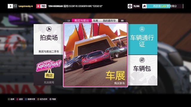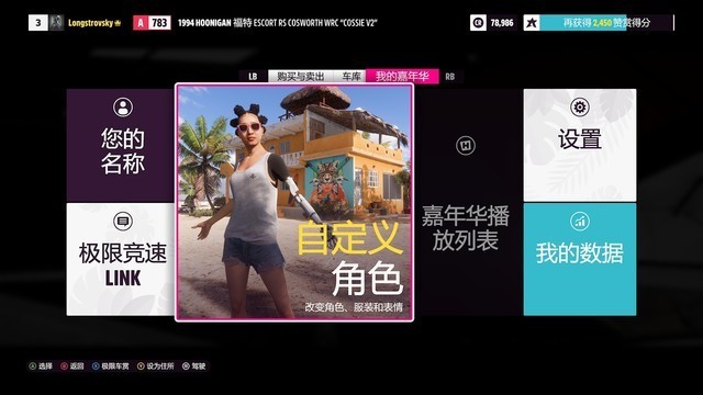 以往大家对赛车游戏的认知好像都是选地图,开比赛,当然从之前的一段时间开始,很多赛车游戏也做了不小的更新,每个任务点和集合点都成为了地图上的一个特定的位置,你想要进入某些设置菜单或者某些赛事,就需要开车到特定的位置去参加,《地平线5》也是这样的,开篇从飞机上空降一辆车下来直接冲到嘉年华会场,这里就是你的总部了,角色外观的设置,赛车改装升级,买车买车,车库管理都从这里开始,不过也有快速回来的方法,只要按下手柄上的“西瓜键”(XBOX logo)选择快速回到嘉年华现场就可以瞬间回家。