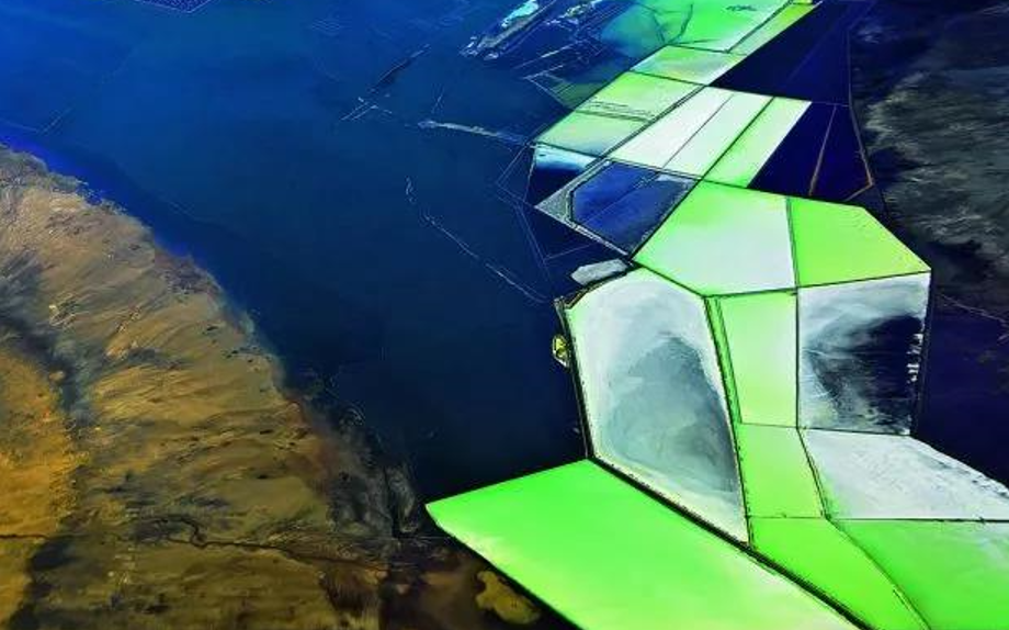柯柯盐湖的湖面上,翡翠色的富有几何之美的盐田绵延向远方,充满了节奏感和艺术性。眼前几座巨大的盐山矗立在眼前,不远处,是盐场的工人们忙碌的身影。在这里,溢出的晶间卤水的泉眼有600多处。