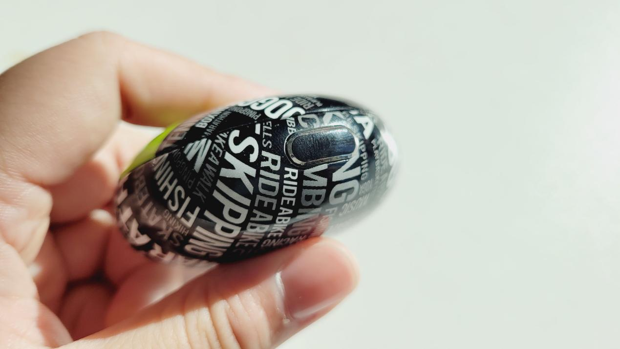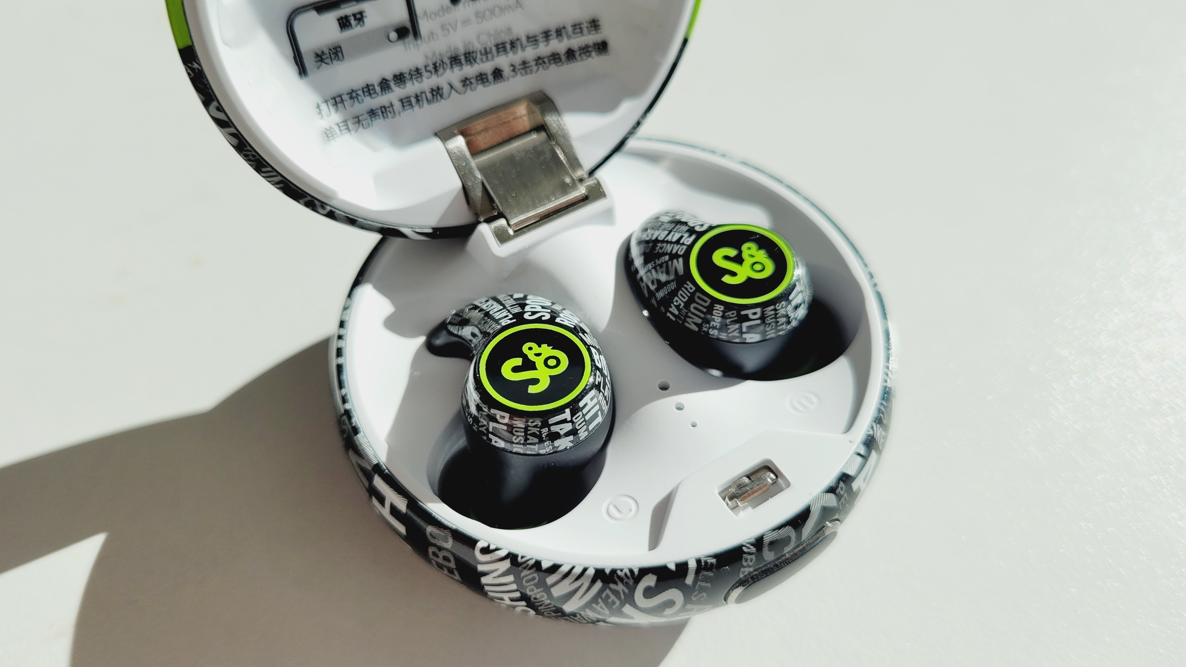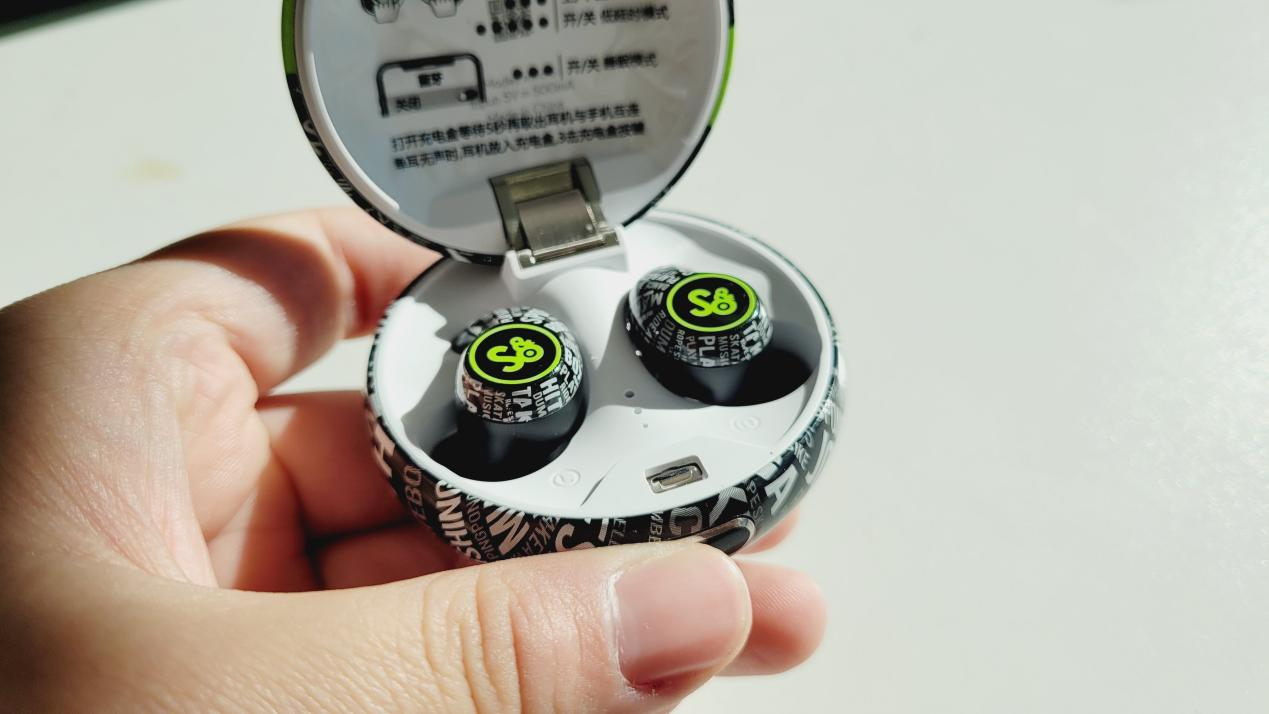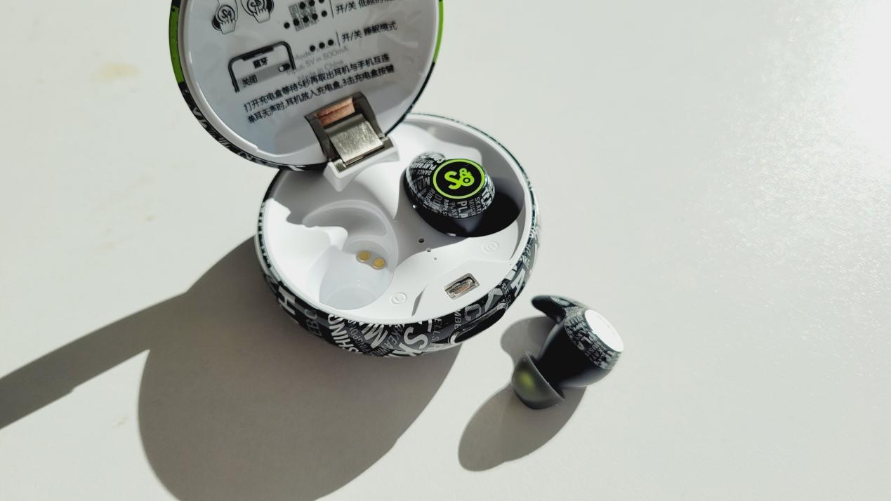 我这款是运动潮配色,魔浪S还有一款青花瓷配色,整个充电仓就像是是圆润的摆件,规则的的艺术字样式看起来非常的酷炫,耳机正面仅有一个开盒按键,轻轻一按,仓盖就会自动弹起。背面也有一个Type-C的充电接口,因为是黑色的,一时间还隐藏在了字中,差点没发现。