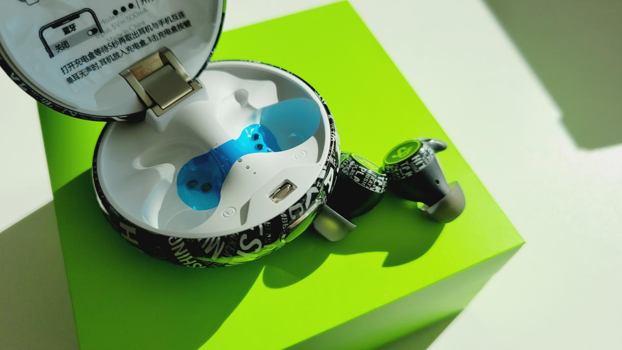 耳机的主体与耳机仓外壳保持一致,都是不同颜色大小的文字排列,中间触控区域则是绿色的魔浪LOGO,整体造型类似牛角,非常的小巧,拿在手里也非常的轻。