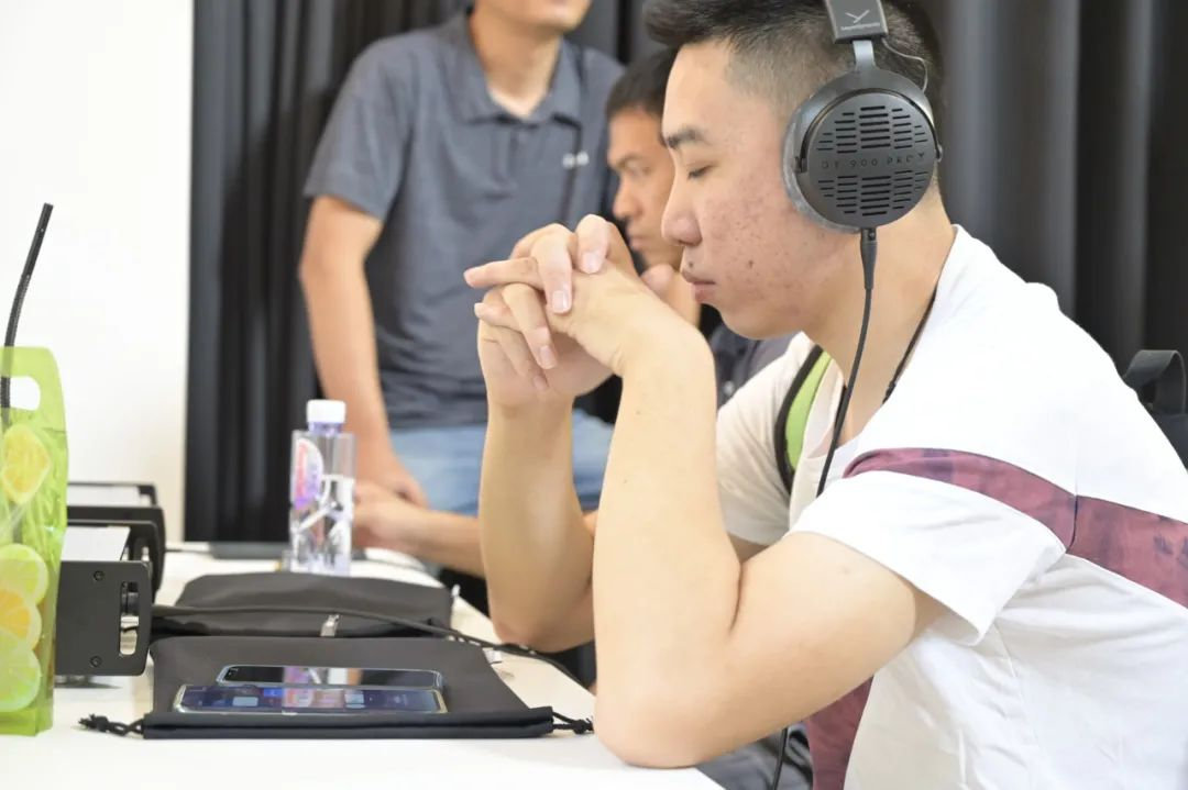 山灵JET1无源音箱虽然定位入门,但其搭载的气动单元高音也有着相当灵敏而且直接的表现力,对音源要求不低。现场播放了多种类型的音乐,上图这位广州知名金属乐队的主唱更用此系统试听了自己的作品。非严谨观察,这位主唱老师几乎听完了整张专辑,系统的音质表现和耐听度可见一二。