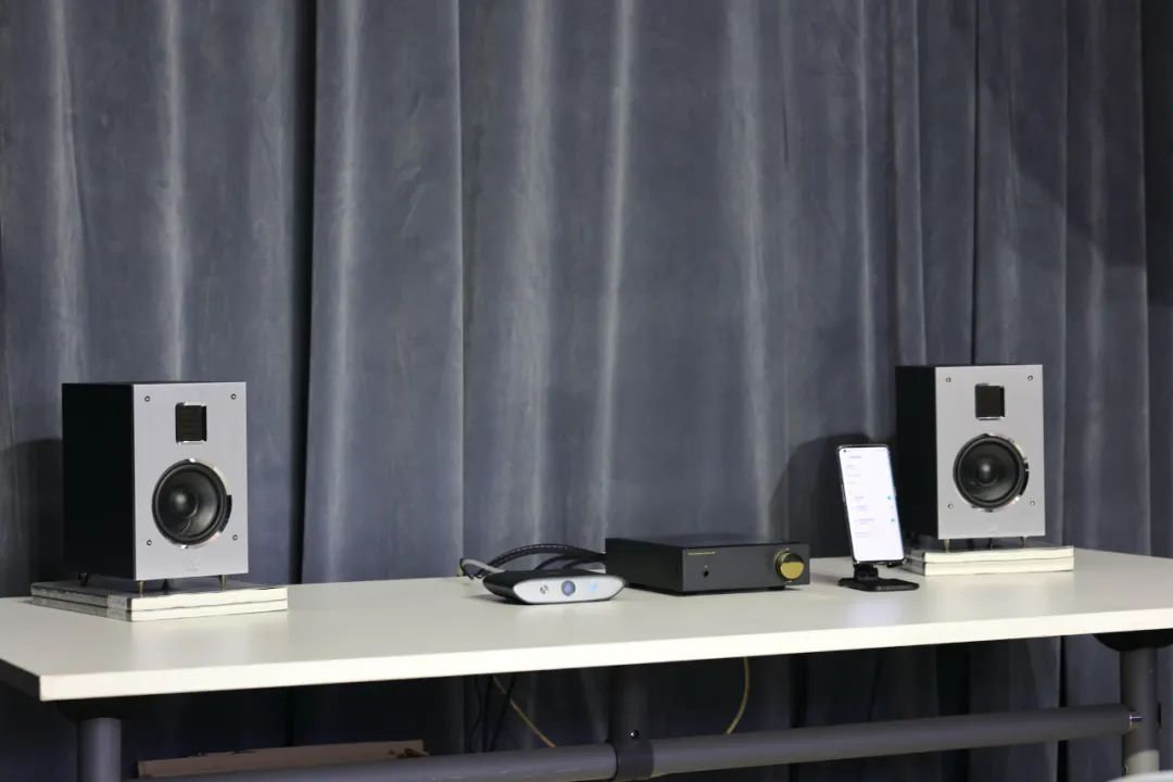 三耳团队还特意在活动中安排了一套轻量级的音箱系统,以iFi ZEN blue蓝牙解码器作为LHDC蓝牙信号的接收端并转成同轴数字信号输出,山灵EA5流媒体功放一体机进行解码和放大,最终由山灵JET1无源音箱出声。