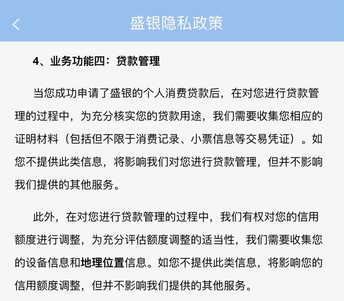客服表示,目前该公司没有额度可达20万元的贷款产品,“装修贷、旅游贷等大额产品目前也不提供。”不过,后续公司会根据用户的贷款使用情况对额度上限进行动态调整。盛银消费金融也在《隐私协议》中提到,为充分核实用户贷款用途,在贷后管理过程中,盛银消费金融需要收集相应的证明材料,包括但不限于消费记录、小票信息等交易凭证。此类信息将影响盛银消费金融进行贷款管理,对用户信用额度进行调整等。
