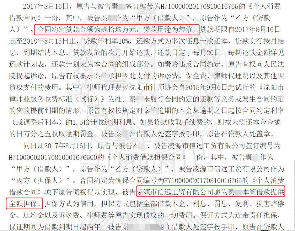 沈阳市沈河区人民法院近期公布的多份判决书显示,盛银消费金融此前曾开展的装修贷业务,放款额度最高达到19万元。以今年9月份发布的一份裁判文书为例,案情显示,2017年8月16日,秦某向盛银消费金融申请消费贷款19万元,贷款用途为装修,贷款期限自2017年8月16日起至2018年8月15日止,贷款年利率10%。该笔贷款中,为确保债权得以实现,还引入第三方凌源市信远工贸有限公司为秦某的该笔借款提供全额担保。担保方式为信用,保证方式为连带责任担保,保证期间为借款到期日起两年。后上述贷款逾期。