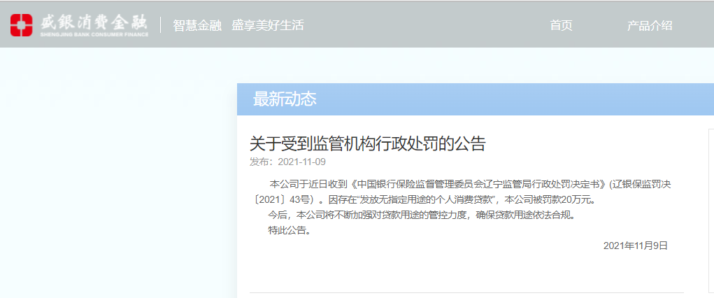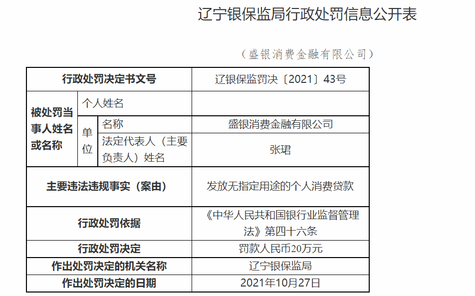 11月9日,记者从盛银消费金融官网获悉,该公司于近日收到《中国银行保险监督管理委员会辽宁监管局行政处罚决定书》(辽银保监罚决〔2021〕43号)。因存在“发放无指定用途的个人消费贷款”,该公司被罚款20万元。