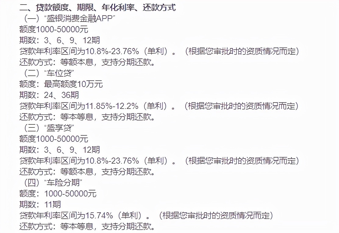 不过,在盛银消费金融APP中,记者只看到了一款循环贷产品,申请额度区间为1000元至5万元。此外,官网显示还有一款车位贷产品,是盛银消费金融面向需要购买或拥有车位的业主发放的分期贷款服务。据客服介绍,该产品的最高贷款额度也只有10万元。