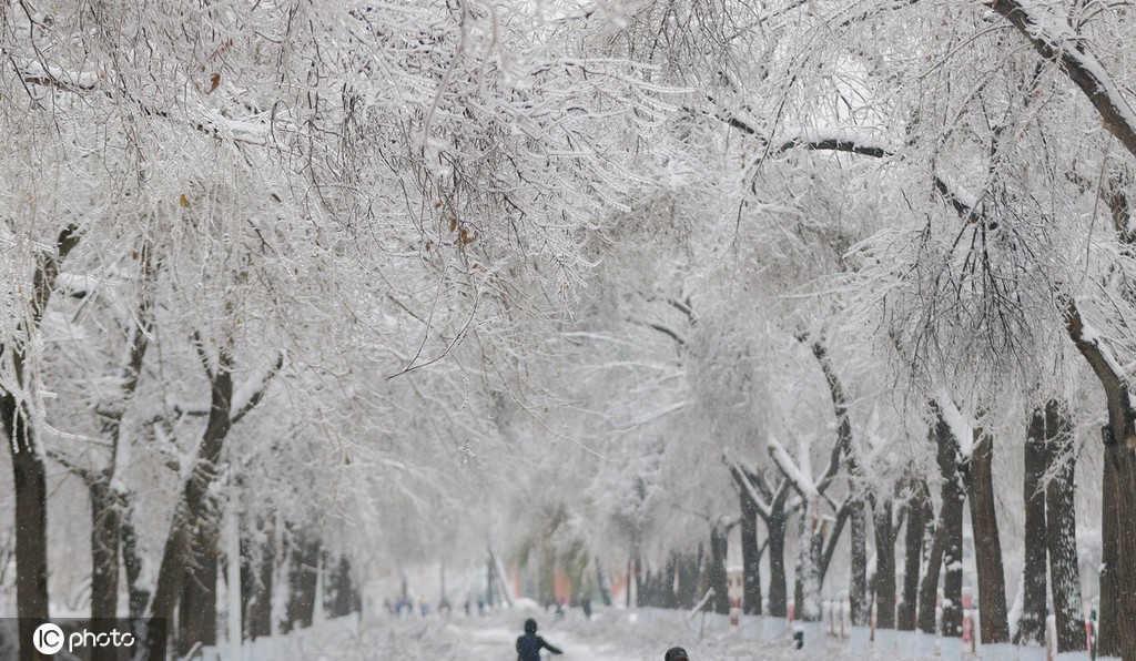 2021年11月9日,黑龙江省哈尔滨市。在60年一遇的强冻雨之后,大暴雪又持续而来,冰冻的树木,压上厚厚的积雪,晶莹剔透,大街小巷银洁如玉,宛如琉璃世界,形成罕见的冰雪淞奇观。
