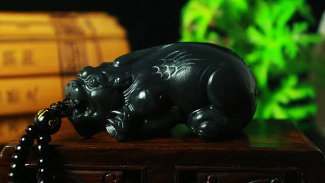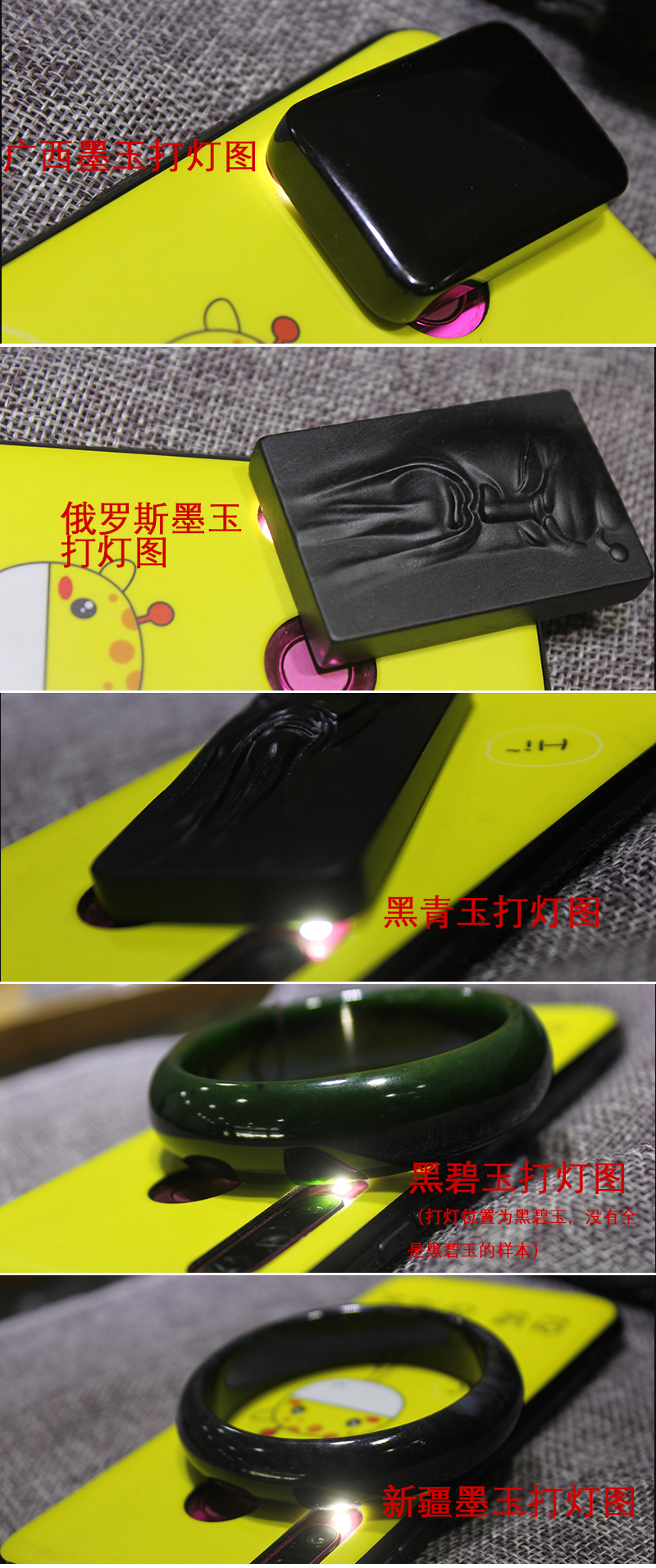 新疆出产的和田墨玉在打强光时,会出现1-3毫米的透光,并且透白色光圈。在市场上还有一种黑碧玉和黑青玉,有些商家会冒充墨玉来卖,黑碧玉打强光透绿色,黑青玉透黄绿色,这点只要稍加注意都可以辨认。