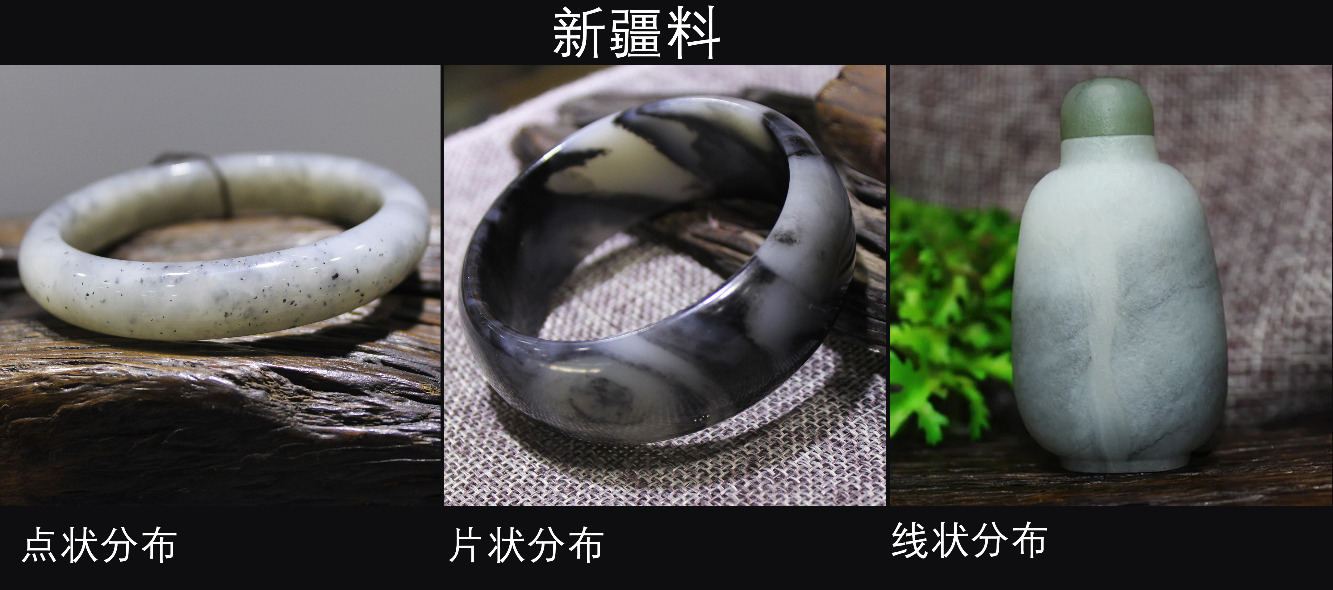 和田墨玉因为有石墨包体的存在相比于其他和田玉密度要小一些。而且石墨包体分布不均匀,导致和田墨玉有纯黑色的,黑如漆最为珍贵。也有呈点状、片状,线状分布的,一般这样的墨玉在行业内称之为青花,但在检定证书上没有这个称呼。