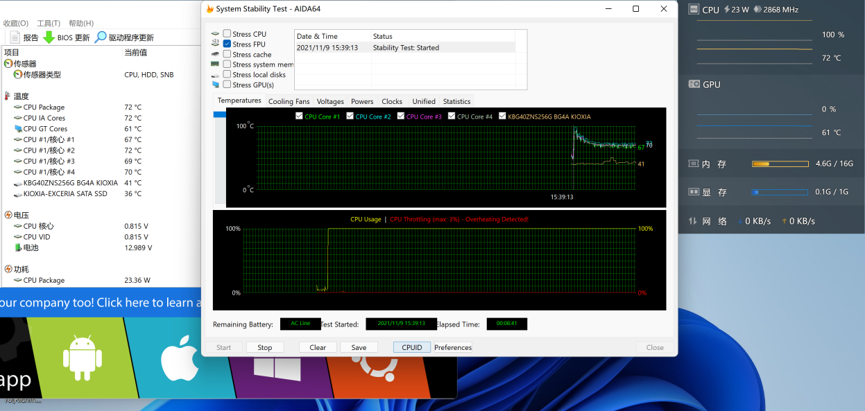 那么薄薄的 Surface Pro 8 能否压得住 28W 呢?很遗憾还是压不住的。我们用 AIDA64 单烤 FPU 模拟最大压力,实测室温 23℃左右,一开始可以在 51W 稳定 30 秒左右,然后在 47W 继续稳定 30 秒左右,撞到 100℃温度墙,然后稳定在 25W,72℃左右,这个散热表现在平板中还是很不错的。