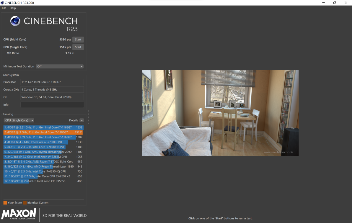 配置介绍完了,接下来我们进入跑分环节,实测 R15 跑分最高 972 分,最低 752 分,长时间运转还是有一定性能损失的。