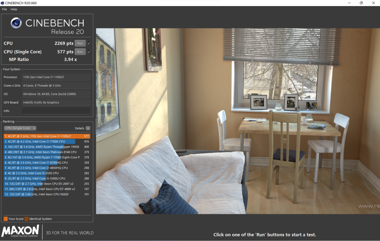 R20 单核 577 分,多核 2269 分。