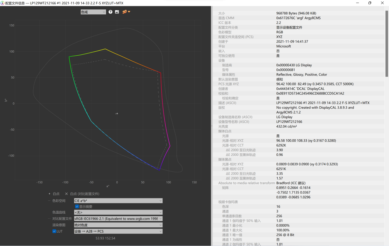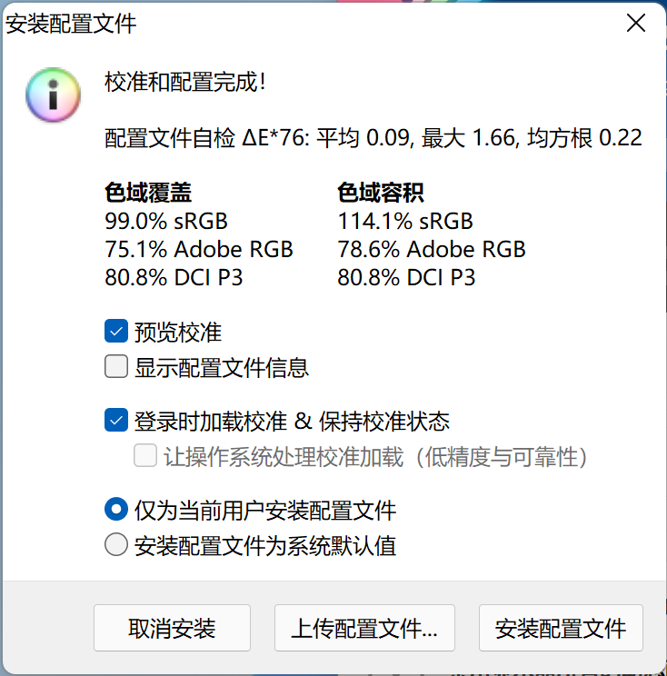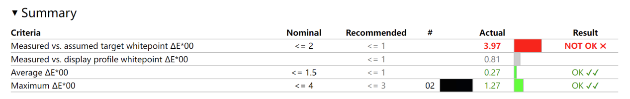 最大色彩偏离值 ΔE 1.27,平均色彩偏离值 ΔE 0.27,表现尚可。