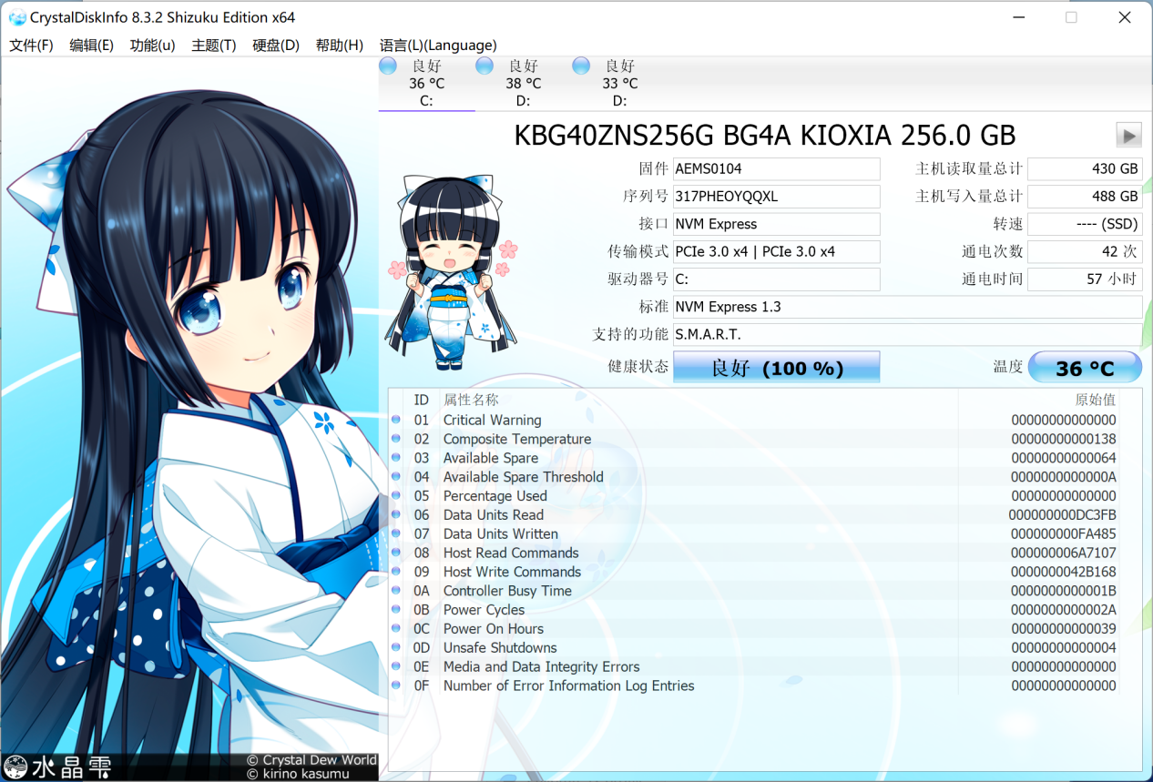 Surface Pro 8 搭载的硬盘是东芝的 BG4 OEM 版,TLC 颗粒,体积非常小,速度表现一般般,不过这个体积下也没什么特别好的硬盘选择,东芝 BG4 已经是相对做的最好的了。