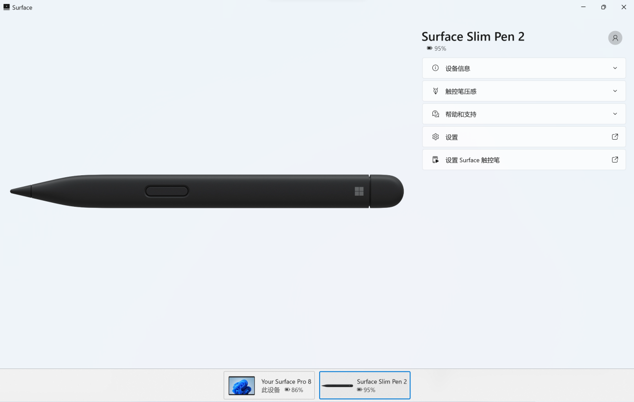 在拿出笔后,Surface Pro 8 会自动弹出工作区窗口,同时 Surface 超薄触控笔 2 也会传来一个微妙的震动,没想到这个小小的笔身内居然还放下了震动马达。在设置界面,我们可以自定义笔的敏感度和快捷键。