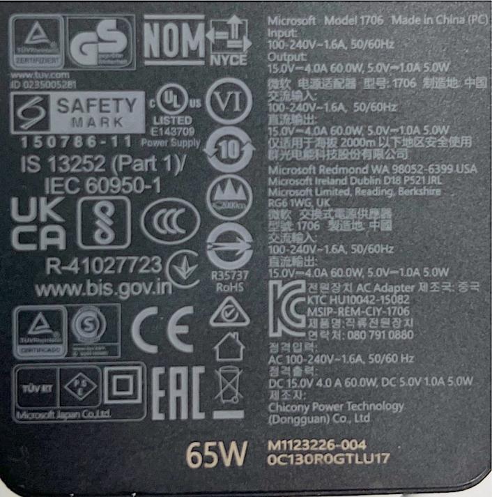 自带的适配器为 65W 的 Surface connect 磁吸充电器,有趣的是这个适配器还提供了一个 5V1A 的 USB-A 输出,可以为手机、鼠标等设备充电。在外出时不想携带适配器的话,也可以用一个 65W 的 PD 充电头充电。
