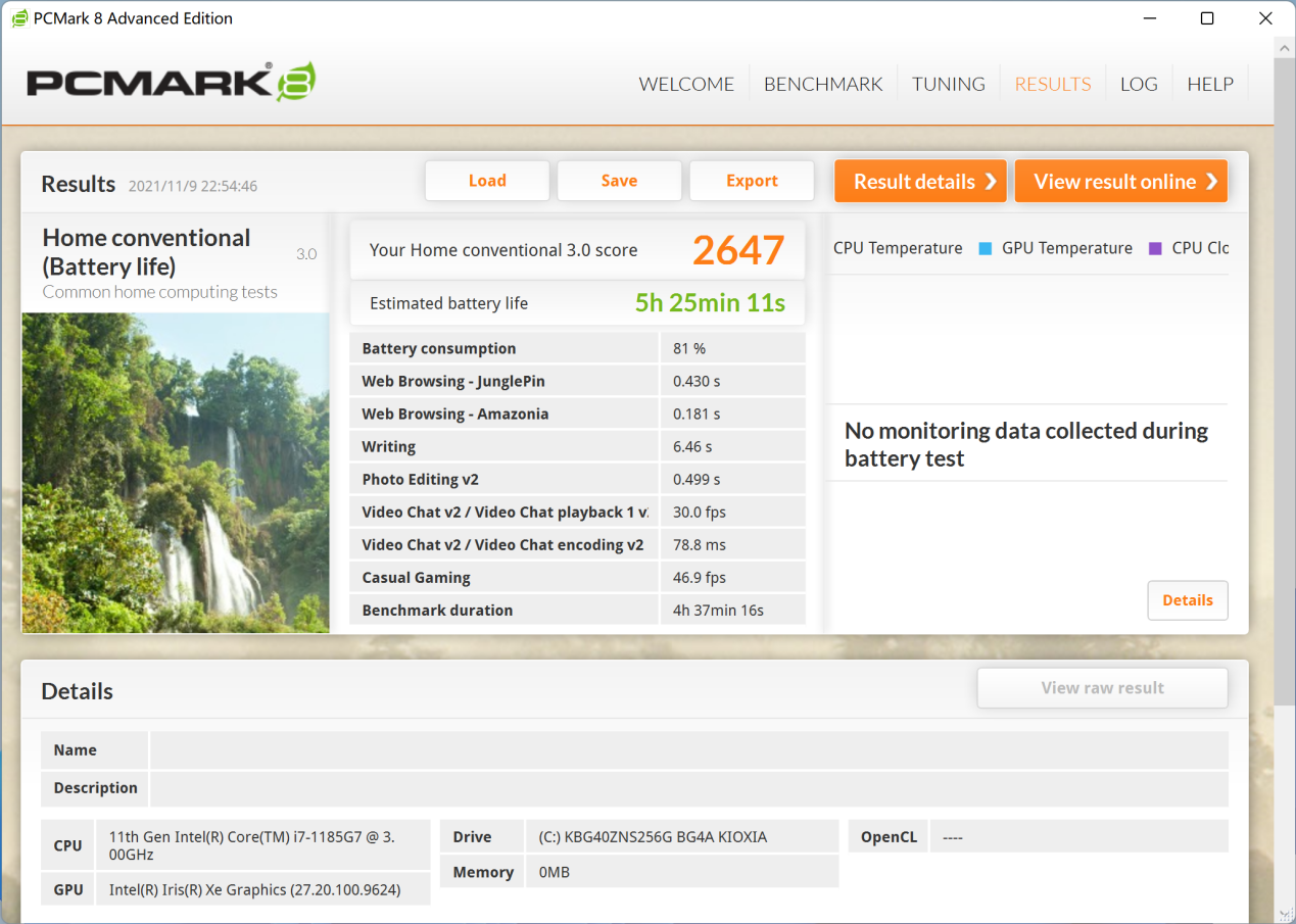 最后IT之家还测试了一下它的续航表现,Surface Pro 8 搭载了额定 51wh 的电池,在这个体积下来说是相当大了。我们开到省电模式,亮度 200nit 运行 PCMark8 续航测试,实测连续运行了近 5 个半小时,这个续航表现还是相当不错的。在外出时我们也可以用支持 PD 的手机充电器来应急。