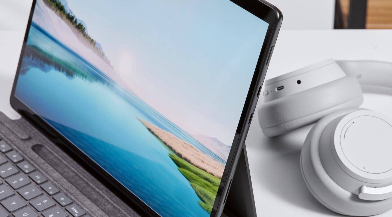 B 面的屏幕此次有了非常大的进化。首先最明显的便是屏占比显著提升,在相似的机身体积下屏幕从上代的 12.5 英寸提高到了 13 英寸。同时分辨率高达 2880*1920,刷新率也第一次来到了 120Hz。可以说这是 Surface Pro 有史以来最大的一次屏幕升级。一个有趣的设计是,Surface Pro 8 在左右黑边各放下了一个扬声器,这样声音可以更直接地传到我们的耳朵。配合杜比视界和杜比全景声,带来极其出色的影音体验。