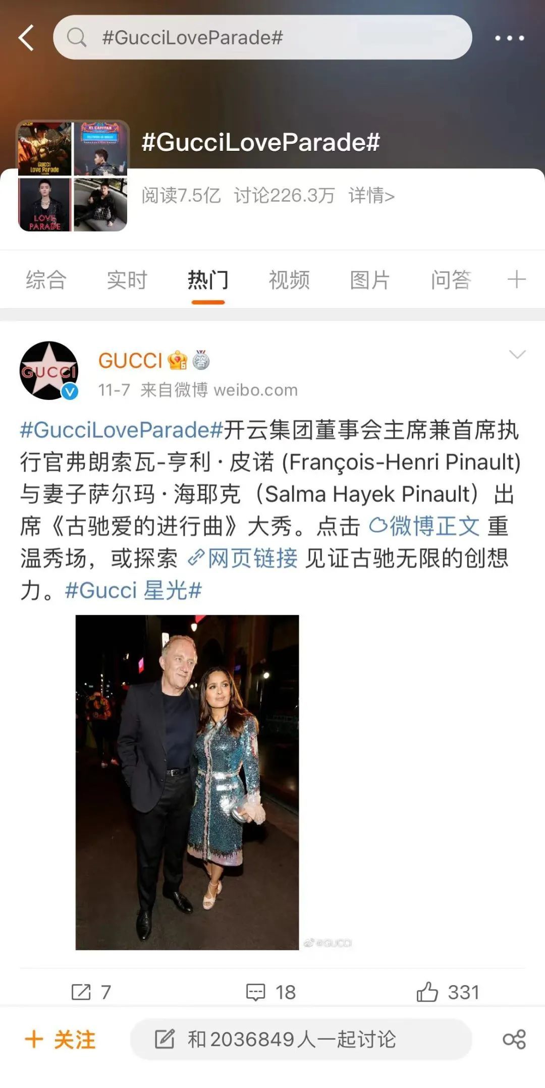 “GucciLoverParade”的微博话题阅读数已经超过 7.5 亿,讨论热度亦多达 226 万