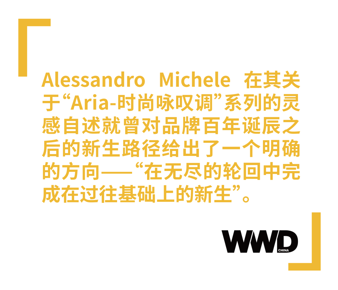 Alessandro Michele 在“Aria-时尚咏叹调”系列发布之后接受 WWD 专访时曾表示:“在去年十一月推出由 Gus Van Sant 执导的《无边序曲》迷你剧集及同名时装系列之后,我意识到在 Gucci 成立 100 周年到来之际,Gucci 要庆祝的不仅仅是关于它的历史,还应该包含它对时尚精髓的诠释。”