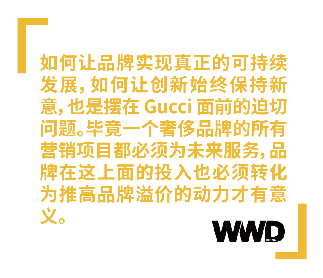 回溯至此,Gucci 在百年纪念活动上的营销思路也已经清晰可见。从横向到纵向,Gucci 的大胆颠覆规则已经帮助其建立起一个先锋创新的新形象。但不可忽视的是,如今的消费者也变得越来越挑剔精明,如何让品牌实现真正的可持续发展,如何让创新始终保持新意,也是摆在 Gucci 面前的迫切问题。毕竟一个奢侈品牌的所有营销项目都必须为未来服务,品牌在这上面的投入也必须转化为推高品牌溢价的动力才有意义。