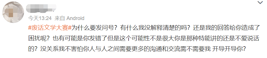 随着「废话文学」在网络上的迅速传播而得到年轻人的高度认可,也吸引了更多的人参与其中,在微博上爆火的#废话文学大赛#,让不少年轻人乐此不疲的参与其中,表情包、段子等多种表现形式给大众奉献了颇多的看点,这也是废话文学爆火的佐证。