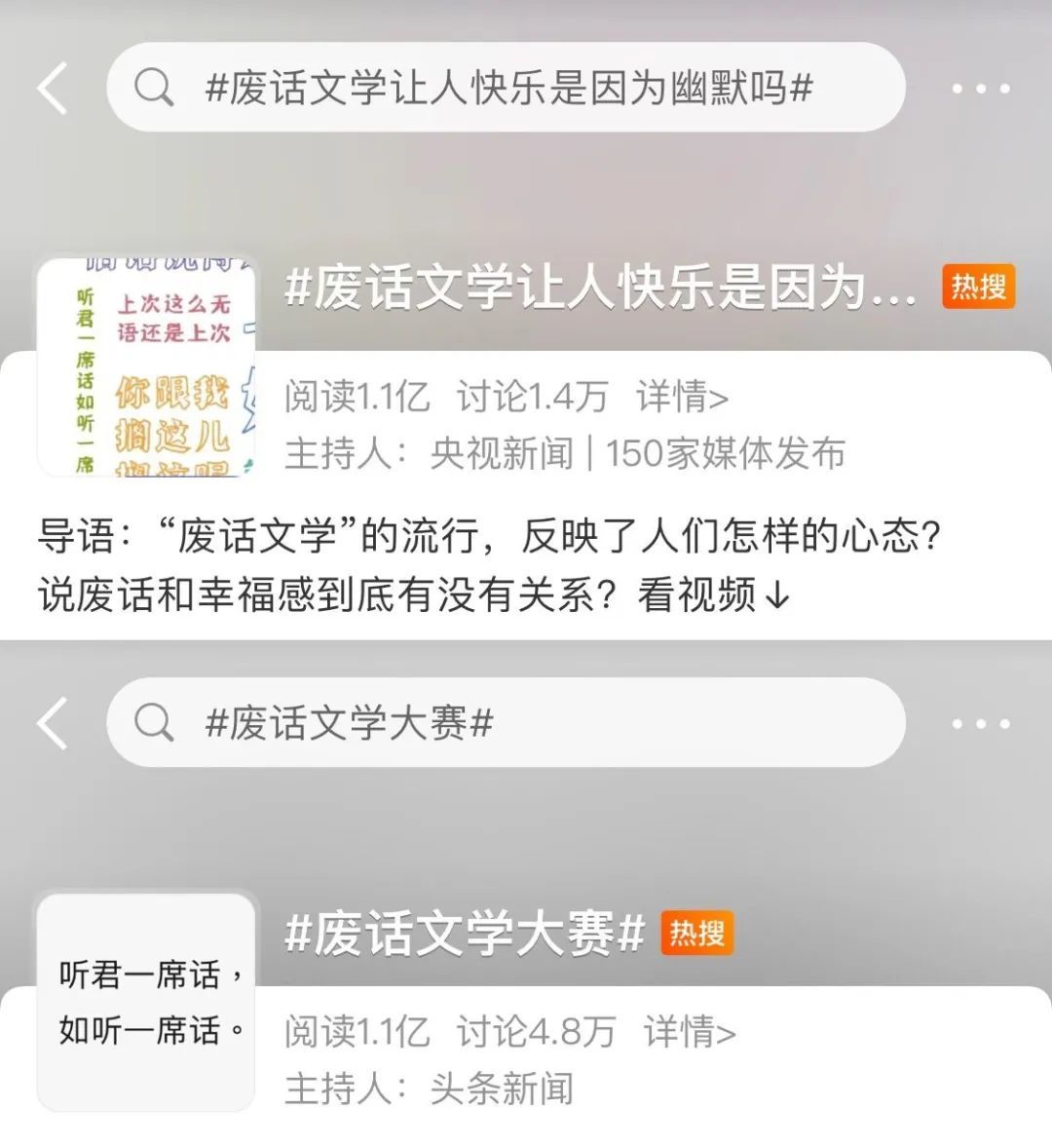 最近「废话文学」的梗持续在各大社交平台上发酵,B站上标题为《废话连篇》的视频播放量已经超过了525万,而在微博上关于废话文学则产生了2个话题热搜,#废话文学大赛#、#废话文学让人快乐是因为幽默吗#,其话题阅读量均超过了1亿。
