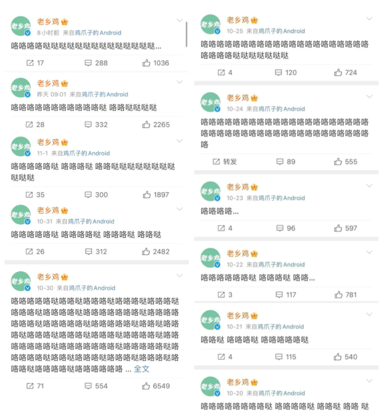 老乡鸡就将废话文学演变成了品牌营销的日常,在老乡鸡的官方微博上,很多微博内容就由“咯哒”两字组成,这既是品牌模仿鸡叫的声音,又将产品特色与消费者的记忆产生了关联,同时还实现了品牌与用户之间的交流。