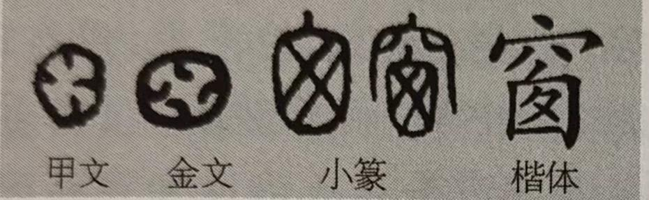 “窗chuāng”,原本是一个象形字,甲骨文的“窗”(即囧,读作jiǒng),乃上古时期“窗洞”的直观白描。《说文》释为:“囧,通孔也。”“通、孔”二字即指形式也讲其功用。冬天,北风呼啸,只好将“窗孔”封起来,因此,《诗经》中有“塞向”之说。金文和小篆早期的“窗”,已有窗棂格条。小篆后期的“窗”字,为了与“囱”(cōng)相区别,以转注(即“建类一首”)的方式,在其上又增添了一个“穴”;楷书缘此而来,演变成一个本义转注字。