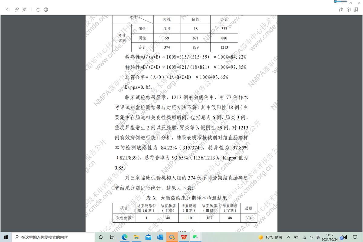 同样发布在国家药品监督管理局官网,可以看到行安心评审报告的数据结果:1213例有效病例统计分析表明长安心“考核试剂对结直肠癌样本检测灵敏度为84.22%”,漏检率高达16%!