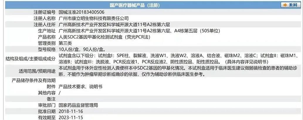 据国家药监局官网,康立明旗下长安心于2018年11月20日获批国家药监局许可,“适用于临床医生建议做肠镜检查的患者的辅助诊断,不能作为肿瘤早期诊断或确诊的依据,仅作为辅助诊断供临床医生参考。”
