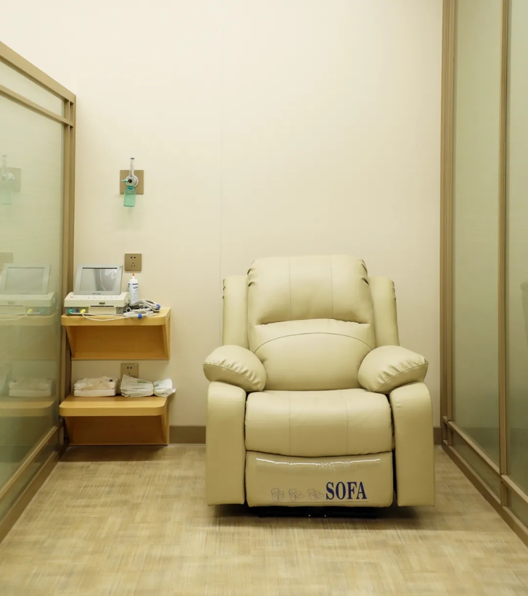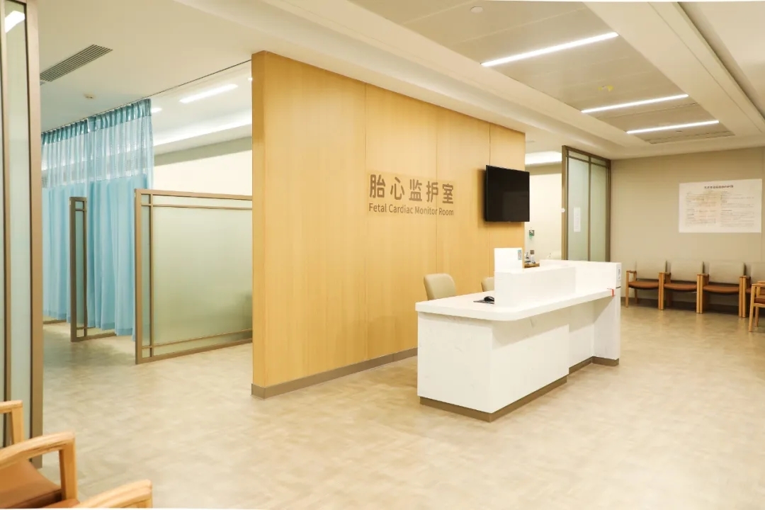 二楼的产科门诊大厅,用落地窗将户外的绿意和阳光铺陈开来,表现公共空间的开放性,而胎心监护室通过围帘和磨砂玻璃创造边界感。