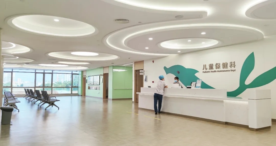 请试着想象一下:阳光倾泻的大楼中庭,悬垂了几个海豚造型装置,身体流线轻巧起伏,好像正潜游于蔚蓝海域。与之相和的是儿科大厅的墙画,一尾摇头摆尾的鲸鱼,憨态可掬。