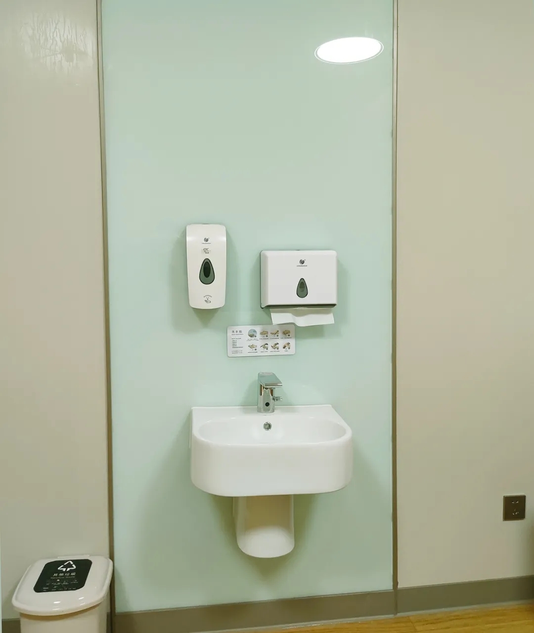 与之相对应的是空间色彩的融合——护士站背景墙的松石绿,过渡到胎心监护室围帘的湖水蓝,是一首关于夏日海滨的浪漫圆舞曲。