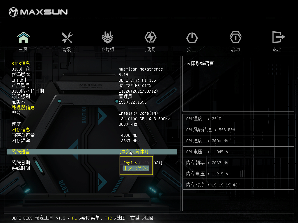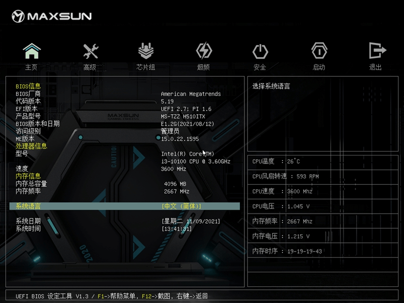 对于铭瑄MS-挑战者H510ITX主板的BIOS可以切换成中文显示,它由主页、高级、芯片组、超频、安全、启动和退出几个页面。正常情况下,基本不用设置就可以直接使用。如果是使用核显的话,就需要在芯片组内对相关使用内存等参数进行设置了。