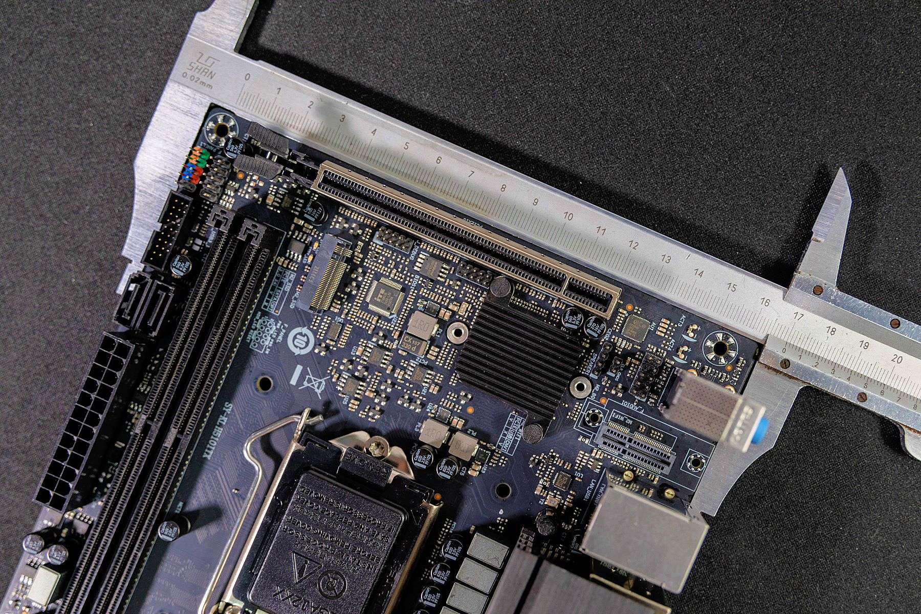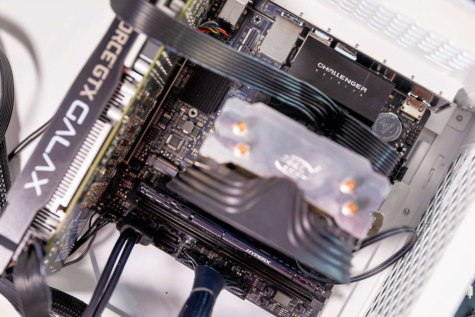 从最终的安装效果图可以看到,主板上的设备之间非常紧凑。因为我这的CPU散热风扇有点大,所以它占用了过多空间。如果是使用小机箱的话,这种散热器估计就不太适合了。另外,CPU的电源线是试机时拍的,最终效果是从机箱底部穿过的。