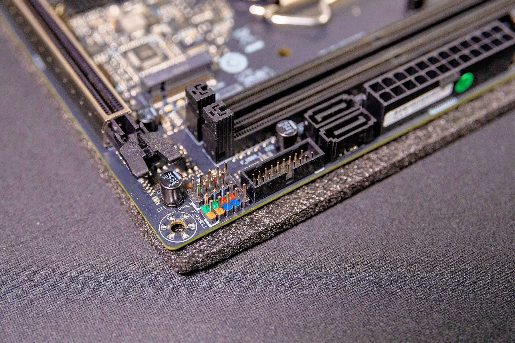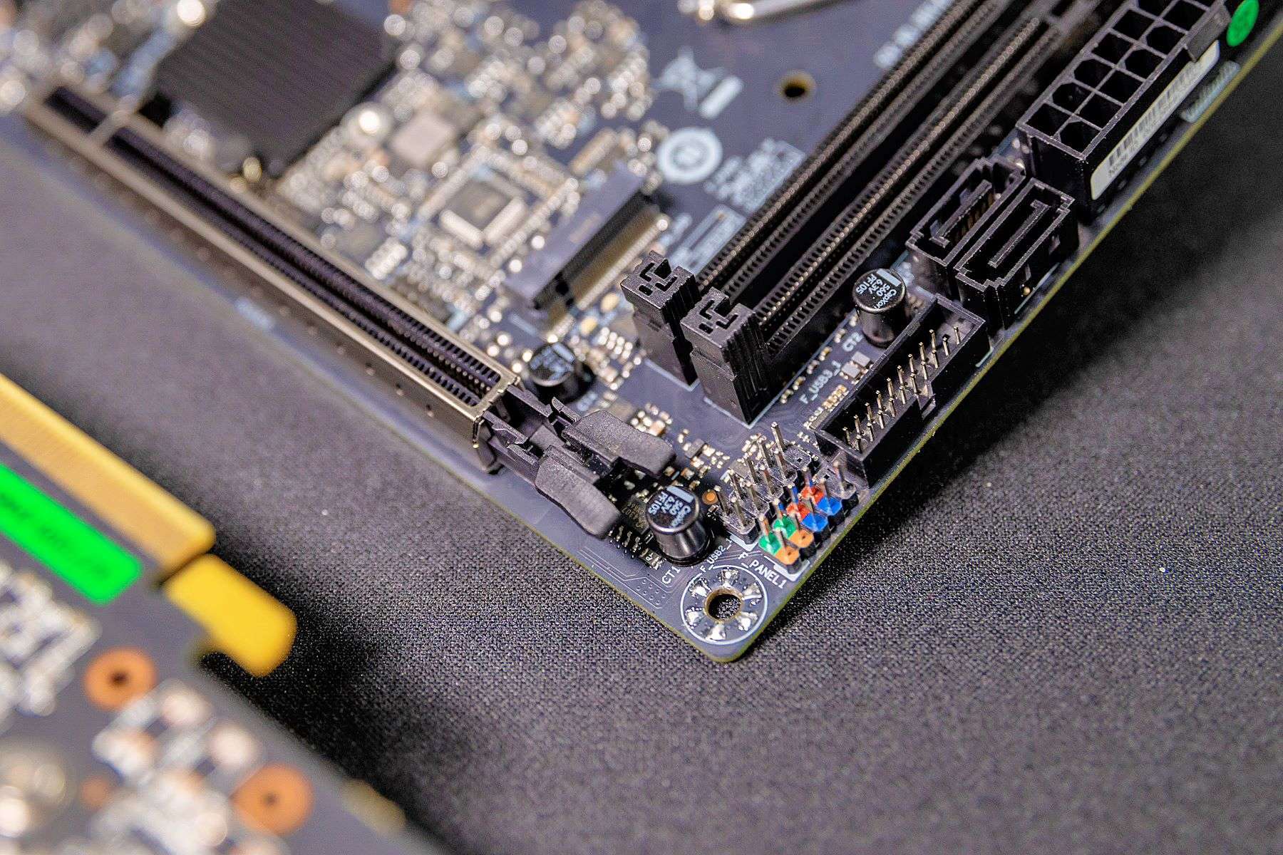 同时,主板还提供了两个SATA接口,可以安装成本更低的SATA固态或机械硬盘。旁边是USB3.0、USB2.0和电源开关等插针。电源开关的这几个插针还采用不同颜色加以区分,对于指示灯只要注意正负极即可,安装还是比较简单的。