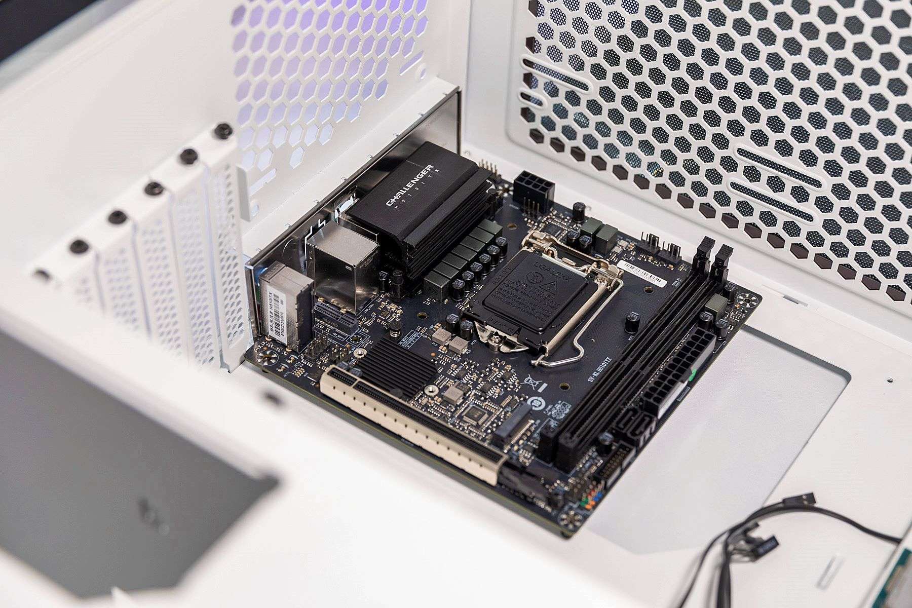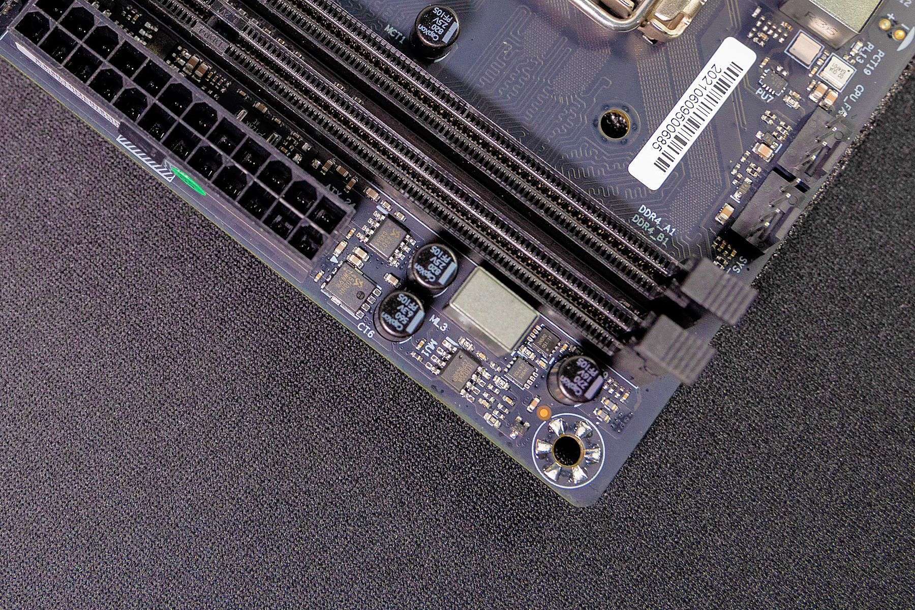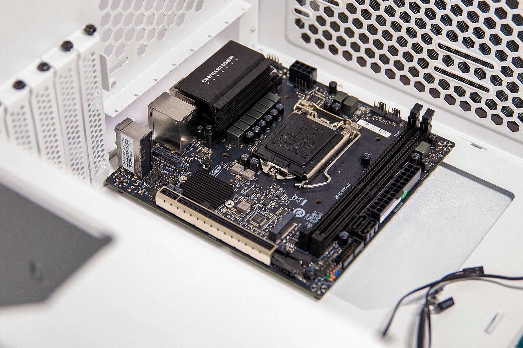 对于挑战者H510ITX主板在一些结构设计上,特别是考虑到小体积主板在安装方面的设计还是非常到位的。比如与机箱的连接接口基本都集中设计在了一侧,从主板背面也可以看到,对于内存、显卡等插槽都进行强化处理。整个外观和做工方面看上去非常优秀。