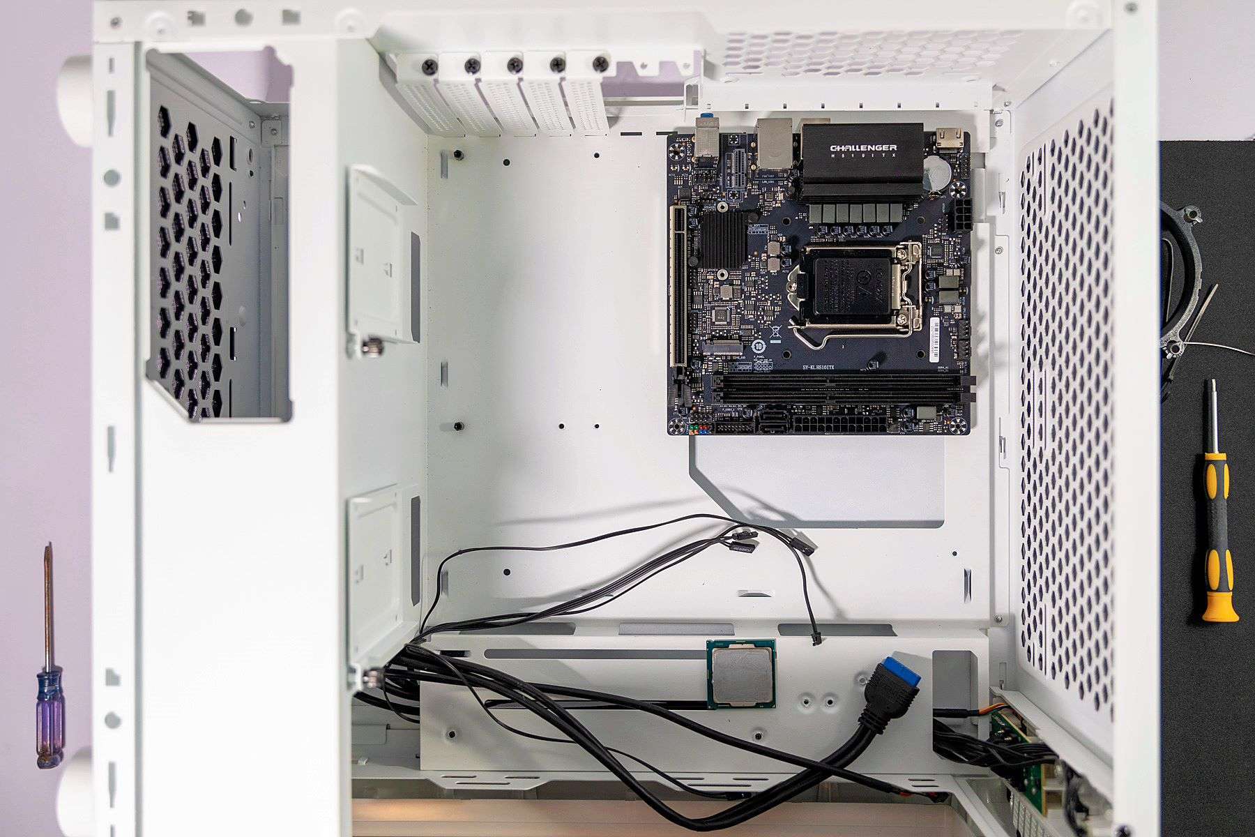 我的机箱和主板同名,都是挑战者。不过,我的是TT挑战者H3标准版,它是一款中塔式机箱。将铭瑄MS-挑战者H510ITX主板固定到机箱位置后就可以感受到这款主板有多小了。
