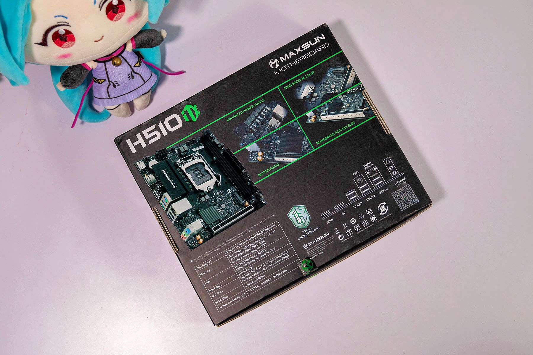挑战者H510ITX主板的包装还算中规中矩,在包装左上角印制有品牌LOGO,左下角是主板的型号,右下角3年的质保标识也是主板品质的见证。包装背面,是主板的参数,接口和厂家等相关信息。
